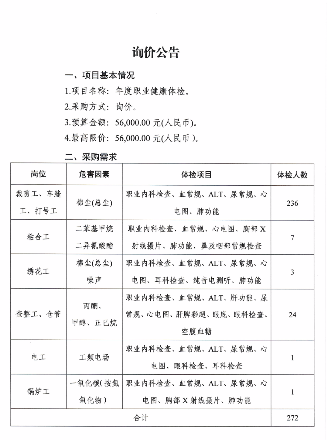 年度職業健康體檢的詢價公告