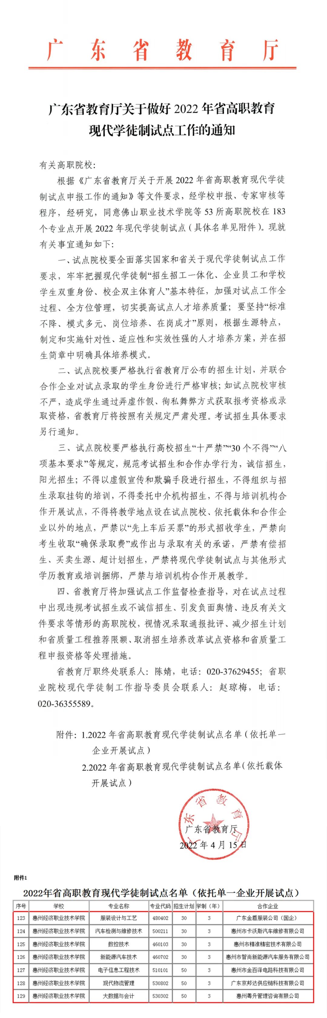 金盾公司入選省級現代學徒制試點企業發表時間:2022-05-12 14:25 廣東省教育廳《關于做好2022年省高職教育現代學徒制試點工作的通知》批準惠州經濟職業技術學院與廣東金盾服裝公司合作開展現代學徒制試點(服裝設計與工藝專業)。 廣東金盾服裝公司將以此為契機,充分利用校企合作優質資源,將人才培養階段前置,加強人才梯隊建設。